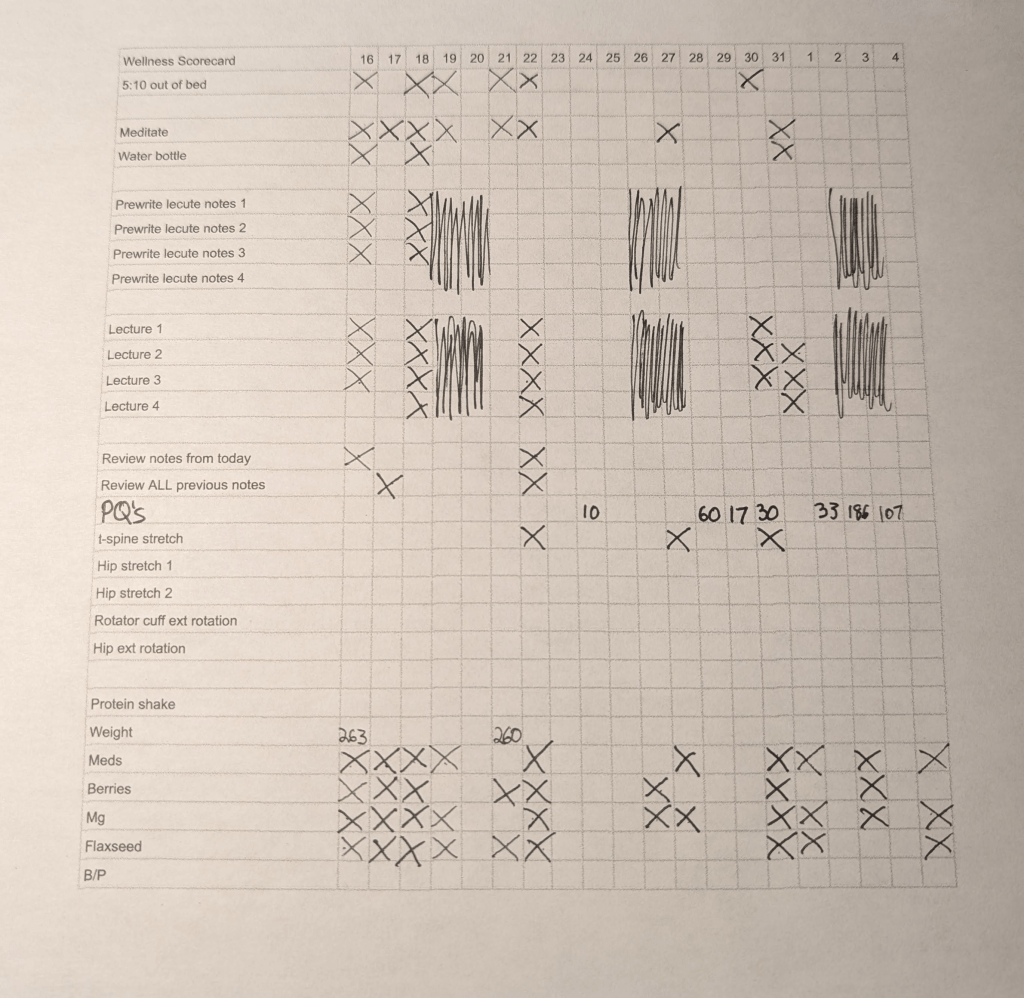 All the changes I’ve made with my scorecard has helped, but nothing has been great. Everything on the scorecard is about doing things and checking them off as I do them, but I am wondering if there are things that I can avoid doing over the course of a day. I think something that will help is keeping track of all of the practice questions I have done for each block and this block I completed 443 PQ’s over the course of the block.